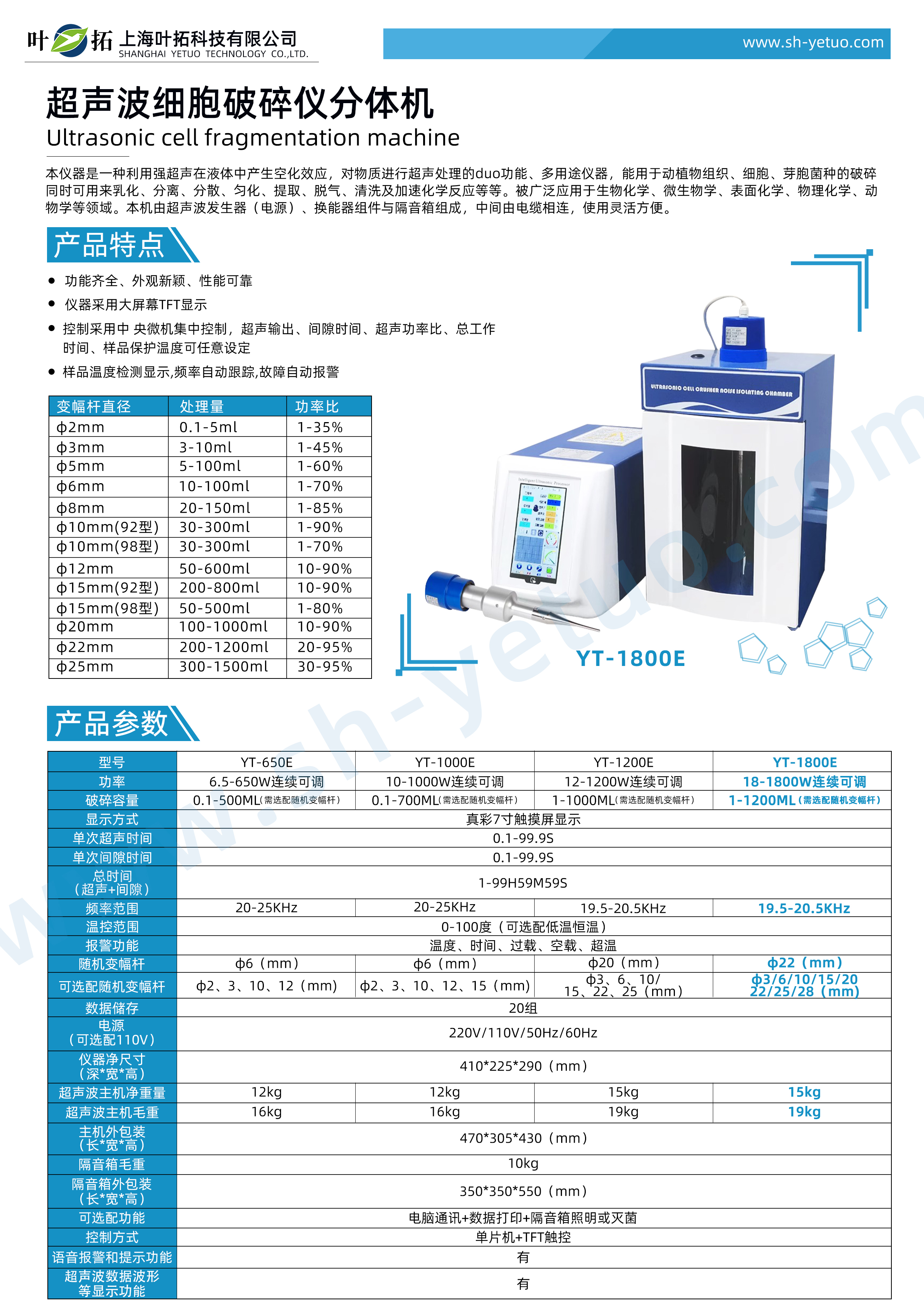 葉拓 YT-1800E 分體式超聲波細胞破碎儀詳細參數
